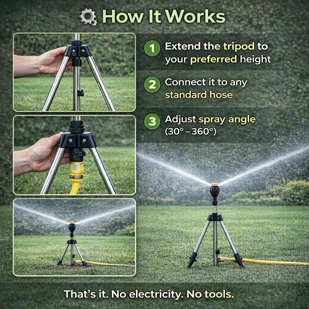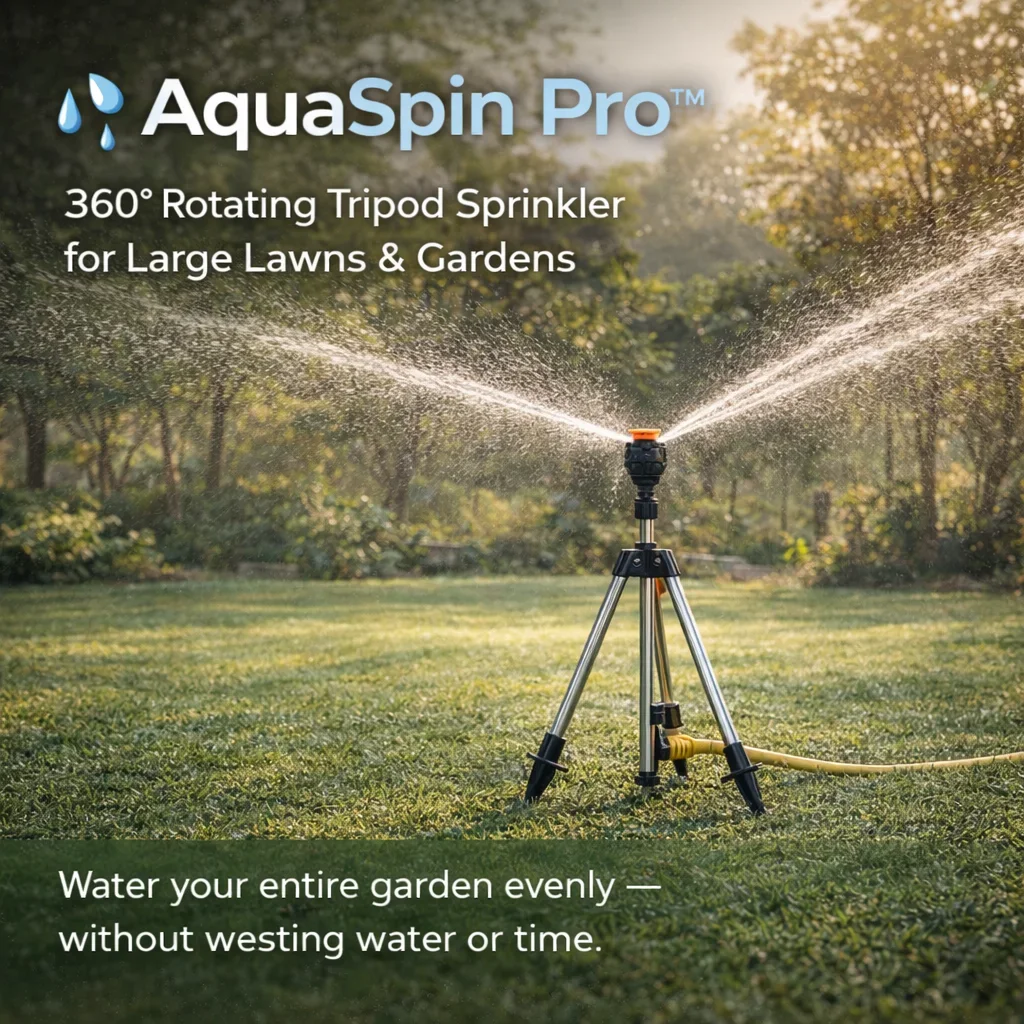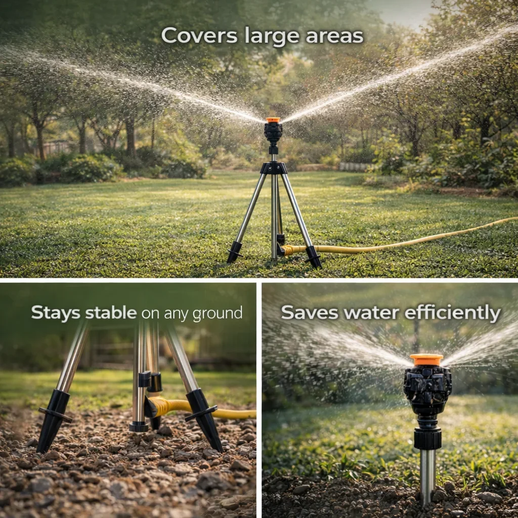 360° Rotating Tripod Sprinkler for Large Lawns & Gardens Water your entire garden evenly — without wasting water or time.