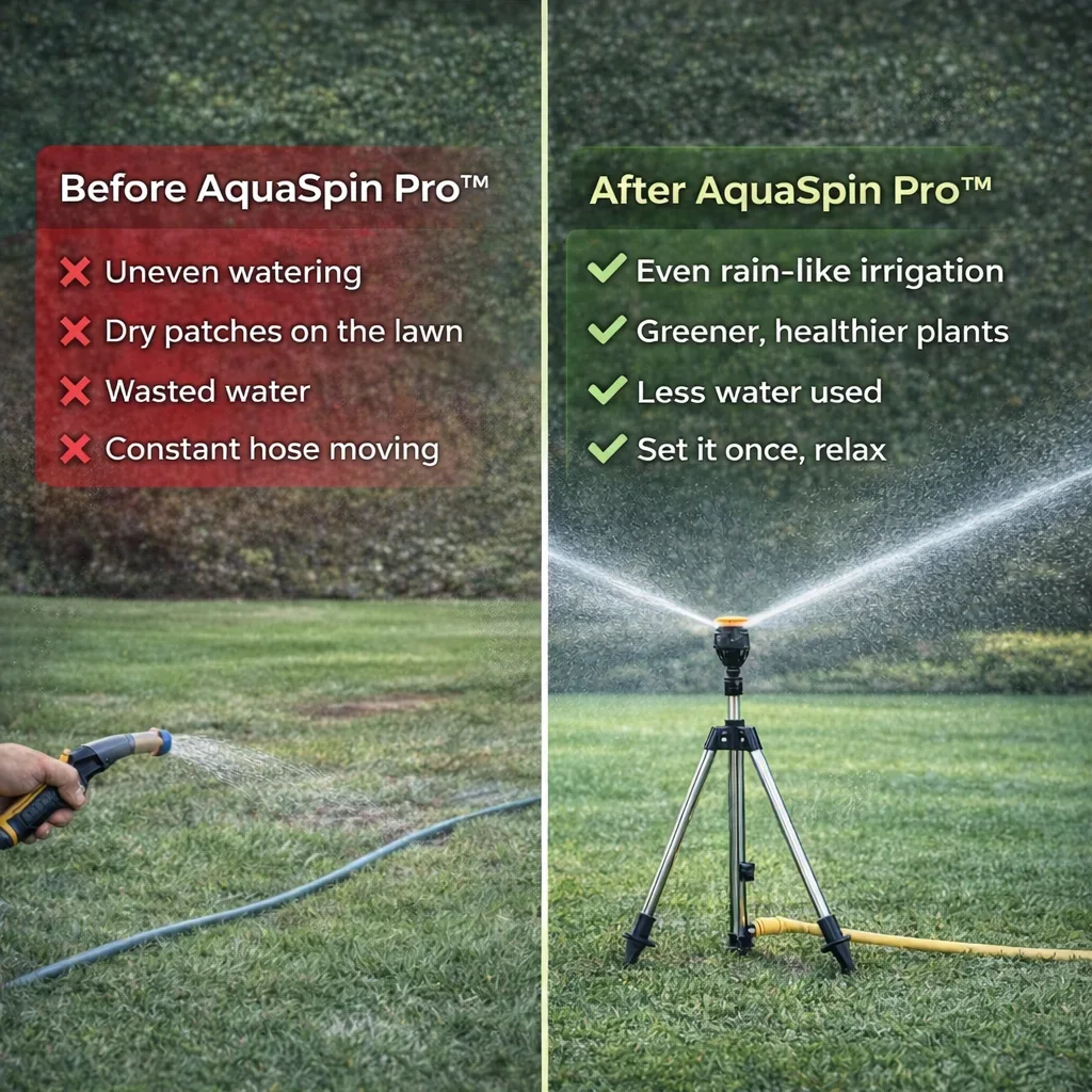 Before AquaSpin Pro™ Uneven watering Dry patches on the lawn Wasted water Constant hose moving After AquaSpin Pro™ Even rain-like irrigation Greener, healthier plants Less water used Set it once, relax