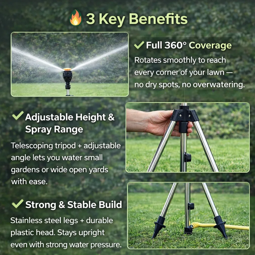 ✔ Full 360° Coverage Rotates smoothly to reach every corner of your lawn — no dry spots, no overwatering. ✔ Adjustable Height & Spray Range Telescoping tripod + adjustable angle lets you water small gardens or wide open yards with ease. ✔ Strong & Stable Build Stainless steel legs + durable plastic head. Stays upright even with strong water pressure.